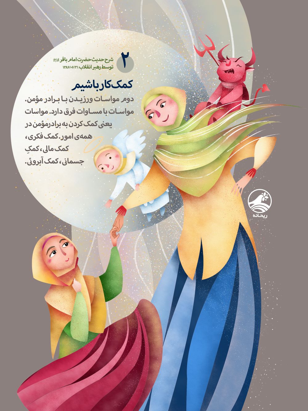 دوم مواسات ورزیدن با برادر مؤمن. مواسات با مساوات فرق دارد. مواسات یعنی کمک کردن به برادر مؤمن در همهی امور. کمک فکری، کمک مالی، کمک جسمانی، کمک آبروئی.